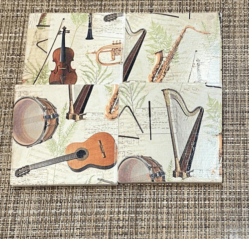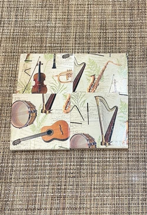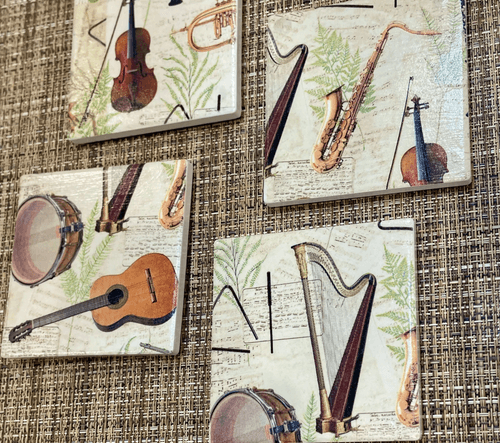 Ahh-Mazing!!! This beautiful 4-coaster ceramic set is a must have for any music lover and will complement any table decor. The rich color of the instruments set on a backdrop of green leaves and sheet music give this ensemble a uniquely modern flare. The rubber button feet help protect your table surface from scratches.