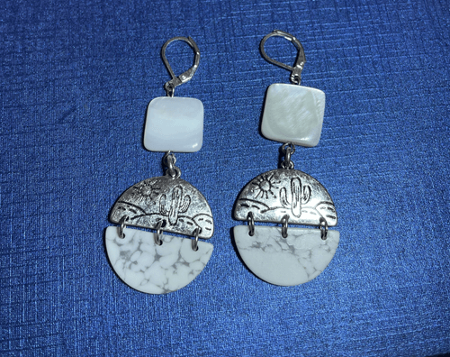 You'll be captivated by etchings of cacti in the sun dangling from a beautiful mother of pearl block. Uniquely designed and hand-crafted, these earrings are amazingly lightweight. Part of our Refresh Collection