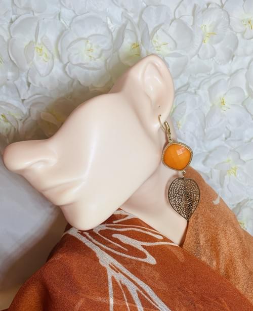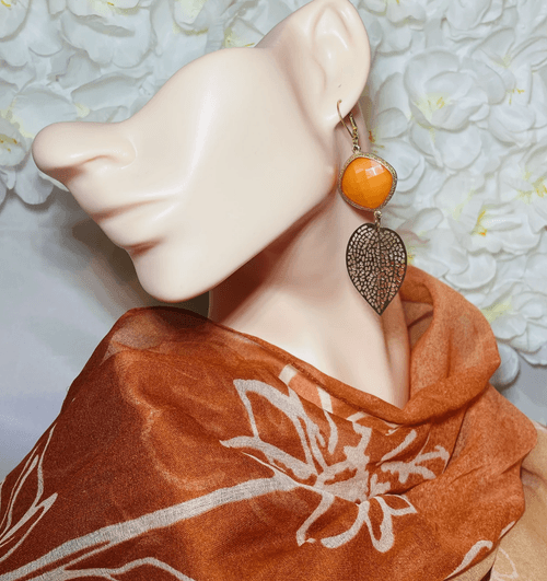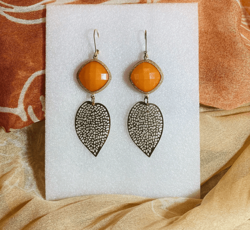 Bold and gaspingly beautiful! A hammered metal, gold tone leaf dangles from a textured orange charm wrapped in a shimmering encasement . These earrings are part of our Refresh Collection, a collection that blends repurposed and new materials together to create beautiful, uniquely exquisite, hand-crafted jewelry. Lightweight and perfect for any occasion.