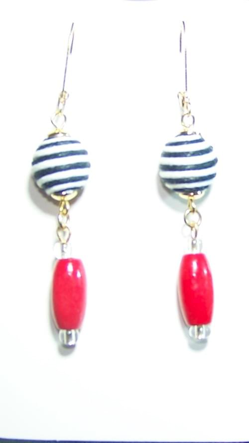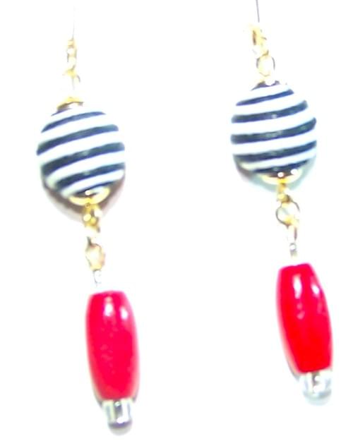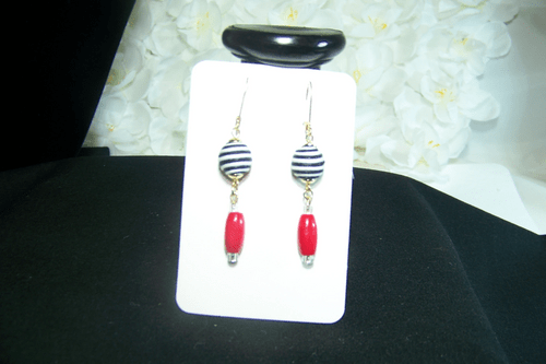These all-American, 1.5-Inch dangle earrings are a captivating blend of color and texture that will add a playful touch to any ensemble. These earrings feature a classic blue and white woven string bead attached to an eye-catching red cylinder-shaped wood bead that is accented with two small crystal beads, adding just a hint of sparkle. The earrings are securely attached to a gold-tone lever back wires, ensuring comfort and ease of wear. Perfect for adding a pop of color and unique flair to your everyday look or for making a statement on a special occasion, these dangle earrings are a must-have addition to your jewelry collection.