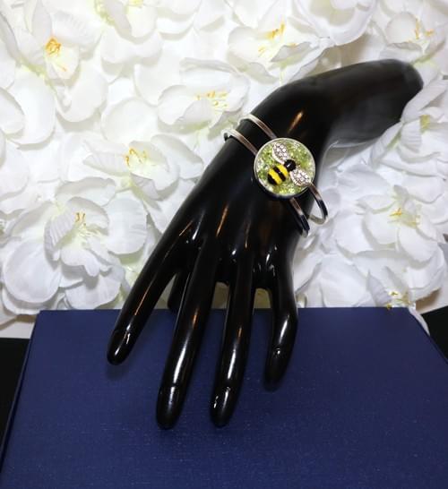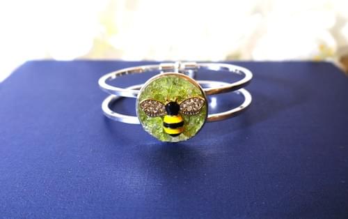 A charming rhinestone winged bee on a crystal bed of Peridot, known as the "Stone of Compassion", create this unique and blissful design, and brings a touch of playful elegance to the classic cuff bracelet. Perfect for both special occasions and everyday wear, the flexible design ensures a comfortable fit for most wrist sizes. Part of the Healing Collection, this eye-catching cuff catches the light beautifully.