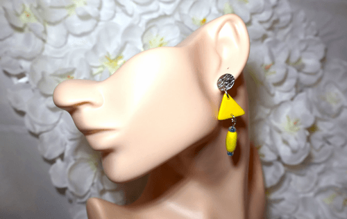 At approximately 2" long, these handcrafted earrings feature a captivating triangle design with a charming tiny glass bead accent. Crafted from polymer in vibrant yellow, these lightweight earrings are perfect for all-day wear. The hammered button stud closure ensures a secure and comfortable fit.