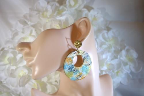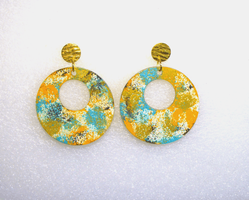 Beautifully hand-painted wood, these earrings are a delightful fusion of playful colors and artisanal craftsmanship. Each earring features a lightweight wood disc boasting vibrant hues of blue, orange, gold and black, dangling from a gold toned hammered metal button post. Approximately 2.5" long, these earring's captivating design exude a unique blend of modern elegance and bohemian flair. Sure to make a statement, elevate your style, and show your individuality.