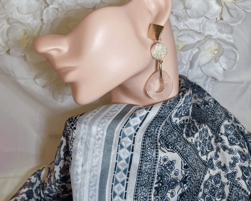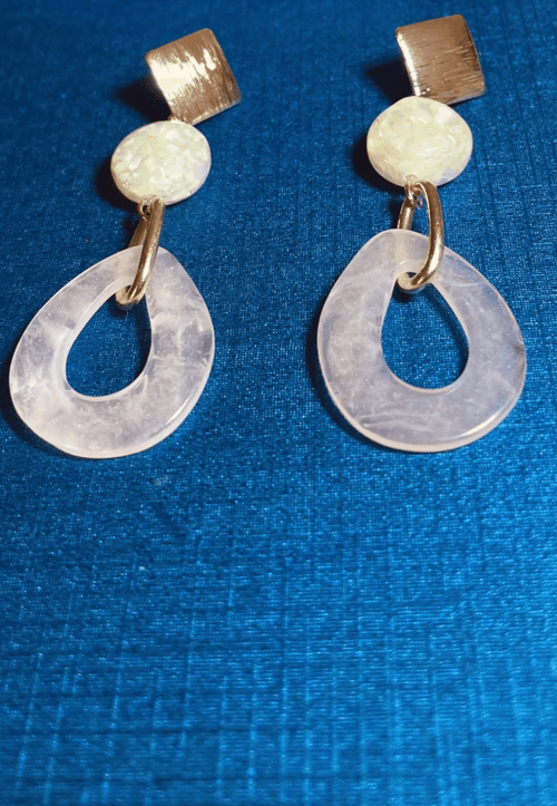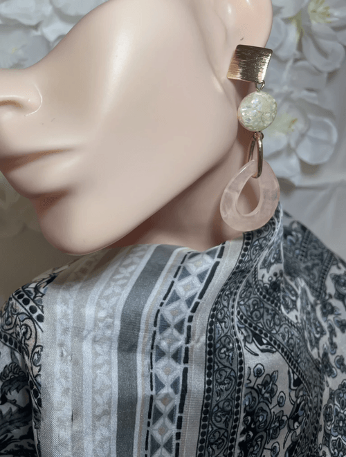 Bold & beautiful! Textured gold tone button studs anchor sparkling mother of pearl beads and delicate blush pink teardrop charms. Beautifully paired and designed by Doe's Daughter to create an amazing statement jewelry.