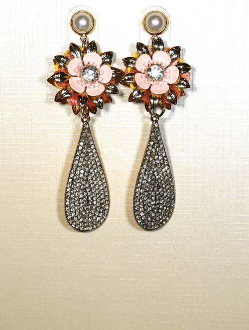 Gorgeous rhinestone teardrops dangling from a pink, gold and amber blossom make these earrings absolutely amazing to look at. The center of the blossom is accented with a single large rhinestone which shimmers perfectly in the light. Part of our Refresh Collection, a collection that blends repurposed and new materials together to create beautiful, hand-crafted jewelry, these earrings are uniquely exquisite. At approximately 3.5" long, these earrings also feature a charming gold and pearl stud.