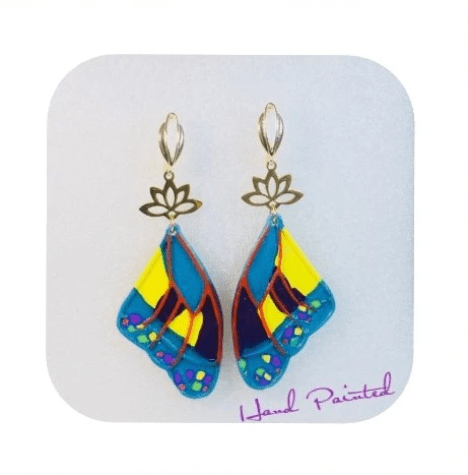 Introducing our Hand-painted Polymer Blue Butterfly Wing and Lotus Flower Earrings, a captivating fusion of nature-inspired beauty and artisanal craftsmanship. Each earring features is meticulously hand-painted and crafted to capture the delicate intricacies of nature. The wing is elegantly paired with a metal lotus flower, symbolizing purity and enlightenment. These exquisite earrings are mounted on gold-toned hypoallergenic studs, ensuring comfort and style for all-day wear. Whether you're looking to add a touch of whimsy to your everyday look or elevate your evening ensemble, these earrings are sure to become a cherished addition to your jewelry collection.