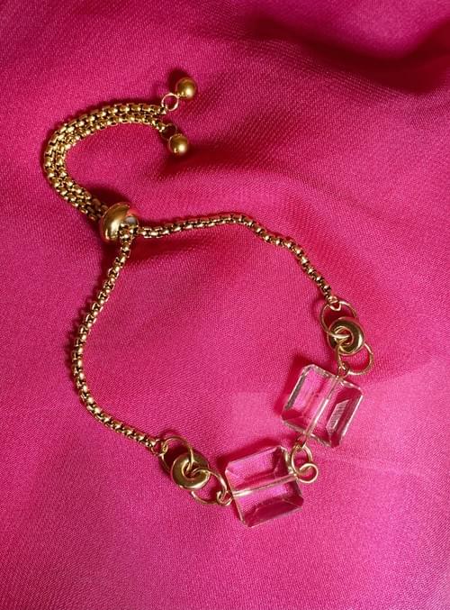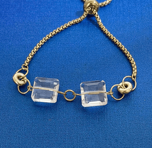 Light just dances off the chiseled acrylic crystals and the gold tone rings enhance the beauty of this amazing bracelet. The adjustable bolo style fits most wrist sizes. Dress up or dress down, this is the perfect bracelet for any occasion and any style.