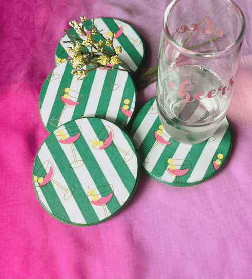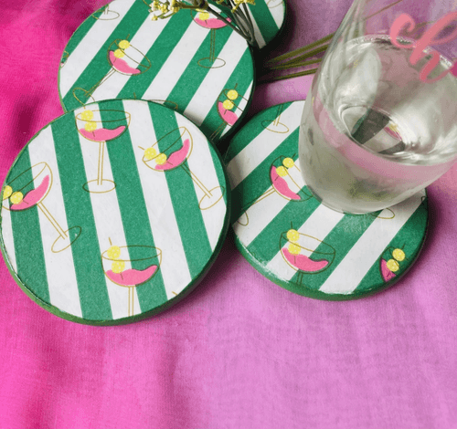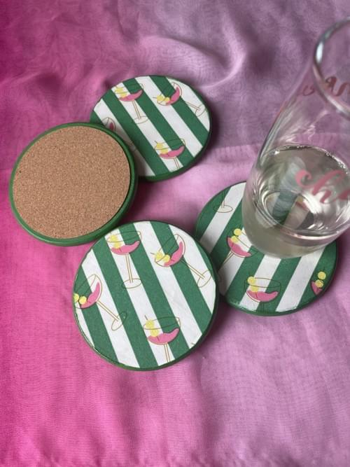 Thes beautiful coasters are perfect for your warm weather entertaining. Bright colors of pink, green and yellow bring the gold foil cocktail glass to life. This 4-coaster set will brighten and complement any table decor and the cork pad base will protect your table surface from scratches.