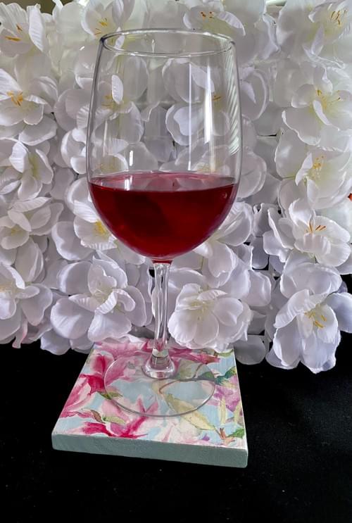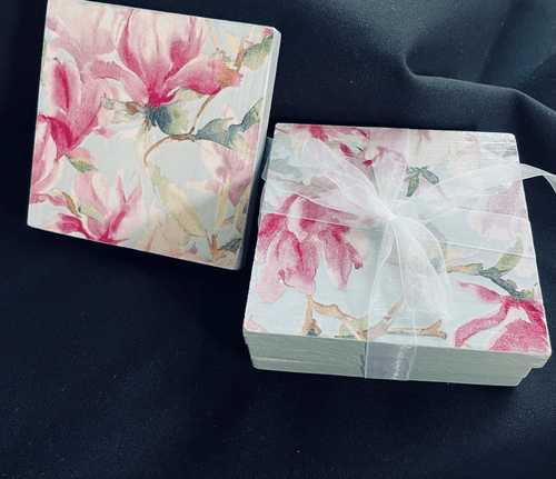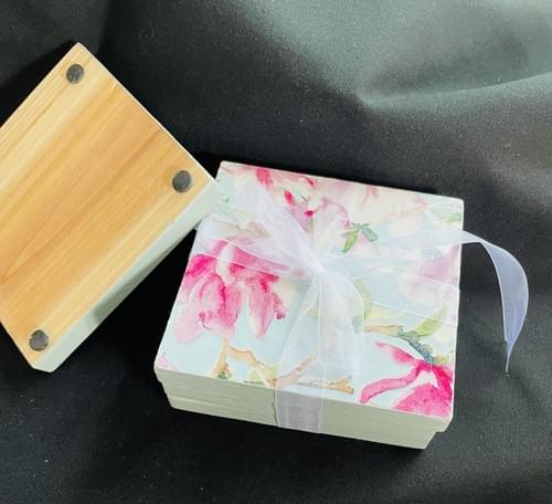The calming mix of pink florals and mint green give these amazing, decoupage on wood coasters a beautiful Zen look that will complement any decor. The base finish is natural wood and has soft button footings to protect your table surface. Sold as a set of 4.