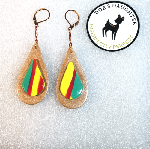 A stunning blend of sass and sophistication, these earrings feature a 3-D teardrop-shaped design dangling from an orange-colored chain. Part of our Refresh Collection, a collection that blends repurposed and new materials together to create beautiful and versatile hand-crafted creations, these earrings are crafted from rose gold polymer and adorned with another teardrop in a captivating mix of green, cherry red and yellow colors. Approximately 2" long, these earrings have an eye-catching, glossy finish and the rose gold lever back closure adds a touch of glamour. Versatile and lightweight, these earrings can be worn for any occasion. Whether you're dressing up for a night out or adding a pop of color to your everyday look, you'll look great in our unique Double Teardrop Earrings