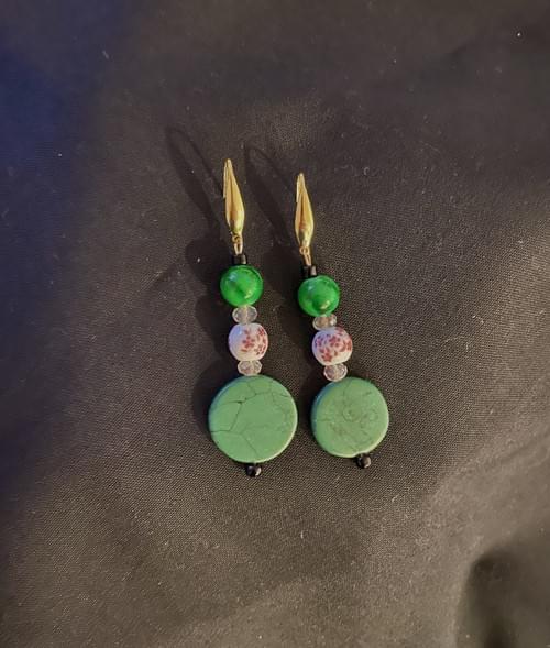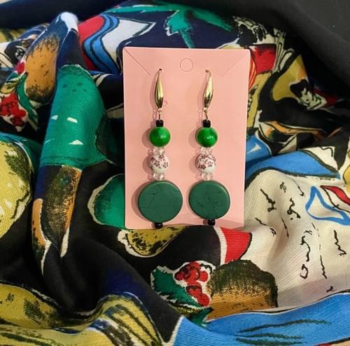 Absolutely stunning! Lava-look discs are adorned by hand-painted floral and green glass beads. The tiny black and crystal accent beads add an element of pizzazz to the design and distinction to these beauties.