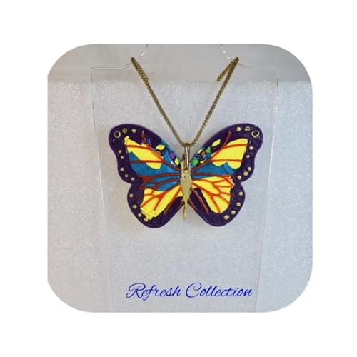 This hand-painted polymer Butterfly pendant is part of the Refresh Collection, a collection that blends repurposed and new materials together to create beautiful, hand-crafted jewelry. In mesmerizing shades of red, blue, yellow, green, orange and gold, this Butterfly blends a captivating fusion of nature-inspired beauty and artisanal craftsmanship. Each wing is meticulously hand-painted and crafted to capture the delicate intricacies of nature. On a gold toned stem and an 18” chain with a lobster claw closure, this necklace is lightweight and versatile. While our handcrafted creations are not perfect, it is our imperfections that give this piece and all our jewelry the uniqueness and beauty found only in a true artisan piece to be enjoyed for years to come.
