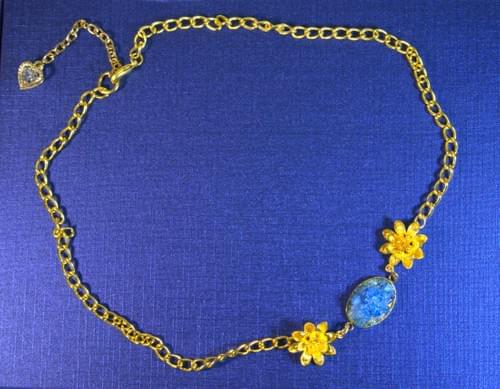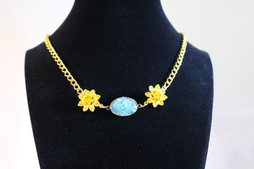 Our handmade Aquamarine Dream Necklace is a captivating piece that exudes elegance and natural beauty. Associated with serenity, transformation and rebirth, these Aquamarine stones were meticulously selected and expertly crafted to showcase its unique hues of tranquil blue, evoking the calming essence of the ocean. Accentuating the necklace are two delicate gold tone flowers, adding a touch of feminine charm and sophistication. Suspended on an adjustable 18" gold toned chain, this necklace is the perfect accessory to elevate any outfit, whether worn casually or for a special occasion. Truly a statement of timeless beauty.