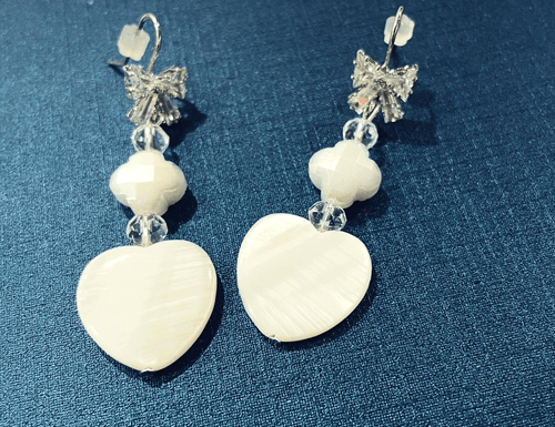 These stunning white hearts were made from shells and accented with a white charm. The 2 crystal balls and rhinestone bow shimmer playfully in the light.