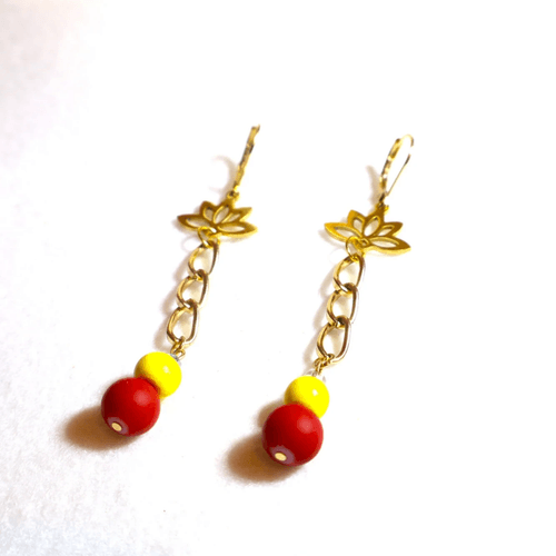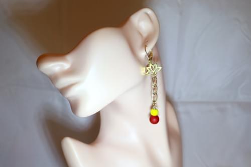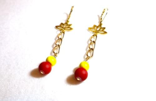 Swinging on a Gold colored chain anchored to a beautiful lotus flower are two bright, playful beads. Measuring 3-inches long with lever back closure, these stunning earrings are comfortable and ready to make a statement.