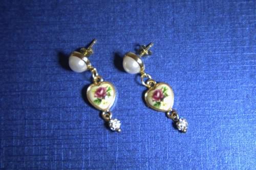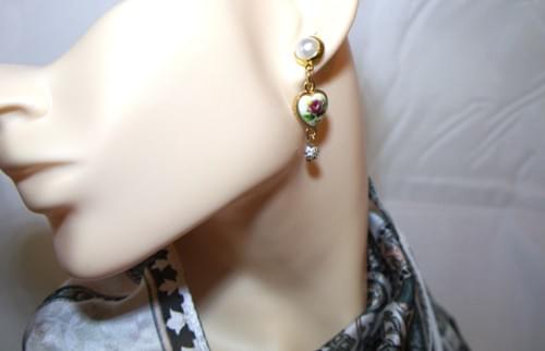 These vintage, Gilded Age inspired earrings are classy and stylish. A delicate rose on ceramic is encased in a gold-tone heart dangling from pearl studs. Tiny crystal chip beads add the right amount of sparkle to these beautiful earrings. Perfect for any occasion.