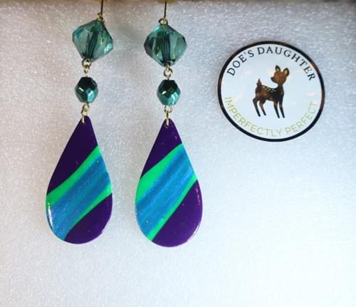 Part of our Refresh Collection, a collection that blends repurposed and new materials together to create beautiful and versatile hand-crafted creations, these Handcrafted Teardrop Earrings, are a stunning blend of oceanic blues, purple and green hues that will instantly elevate your style. At 4" long, these earrings feature a captivating teardrop design. Lightweight and crafted from polymer in a vibrant mix of colors, each earring is adorned with emerald-colored beads, adding a touch of elegance and sophistication. The lever-back closure ensures a secure and comfortable fit, making these earrings perfect for all-day wear.