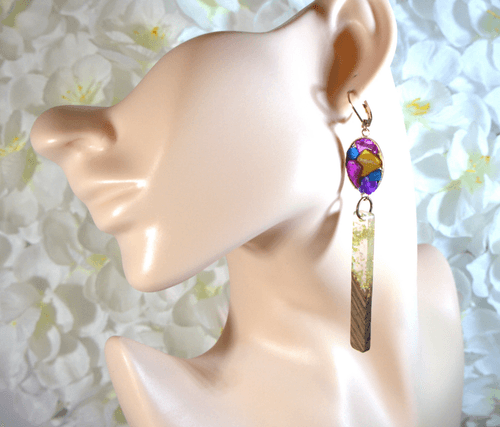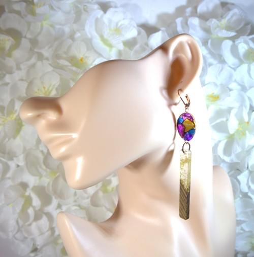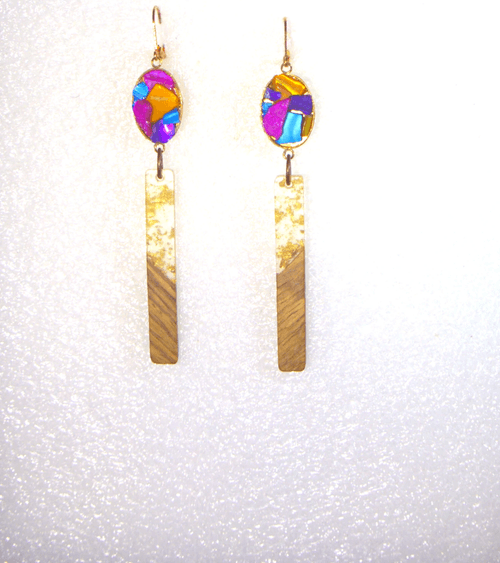 Dangling from a bevel of hand laid stones in a myriad of vibrant colors, is a gorgeous color block pillar of natural wood and vibrant gold foil acrylic to create an eye-catching contrast. Sophisticated and sleek, these lightweight earrings are secured with a stunning rose-gold wire and are perfect for all-day wear.