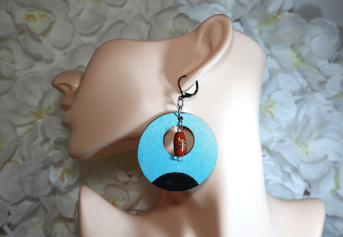Dangling from a black lever-back wire and 2 silver rings is a vividly hand-painted, natural wood disc accented by a playful stamped bead. Casual dress or dressing up, these lightweight and comfortable for all day wear.
