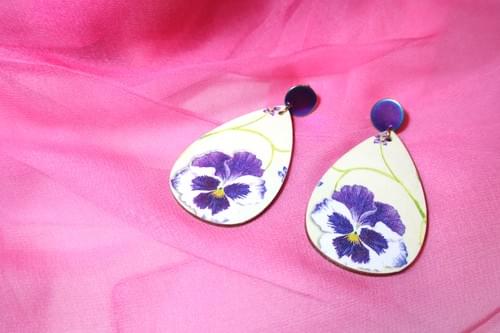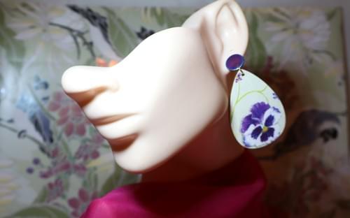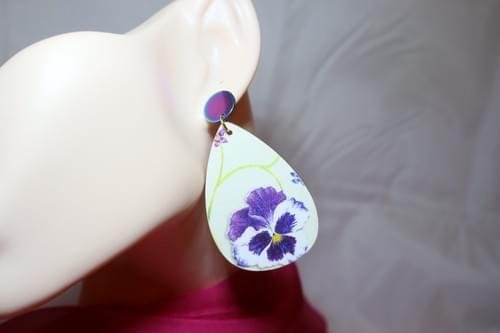 These beautifully crafted decoupage on wood pansies, are mounted on mermaid ombre button studs. So exquisite and so lightweight, these earrings can be comfortably worn all day and well into the evening.