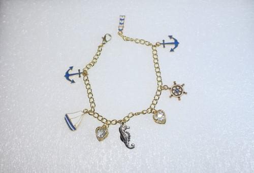 A playful seahorse, lighthouse, and other nautical charms make this the perfect charm bracelet for any occasion. Gold tone, hypoallergenic with a lobster claw clasp.