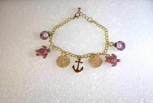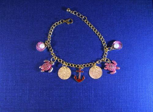 The Seaside Charm bracelet is elegant and uniquely crafted. Dangling pink shells, pearls, turtles, and glimmering gold discs surround a distinctive red anchor. The lobster claw closure provides the wearer with the freedom to adjust the chain link bracelet to a comfortable fit.