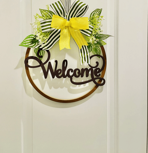 This unique wood hoop wreath will brighten your entryway with its brightly colored double bow, sprawling philodendron leaves and tiny white flowers. Perfect for hanging between your storm and main door.