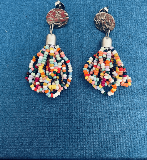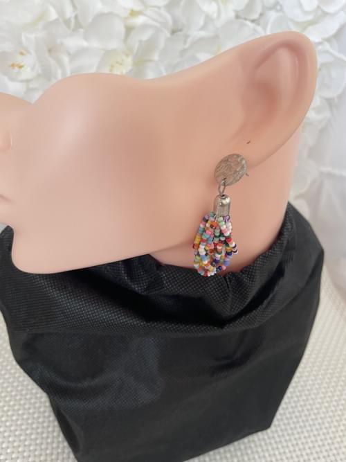 Strands of tiny multi-colored beads dangle playfully from the silver hammered button stud. Dress up or down, these earrings are perfect for any occasion.