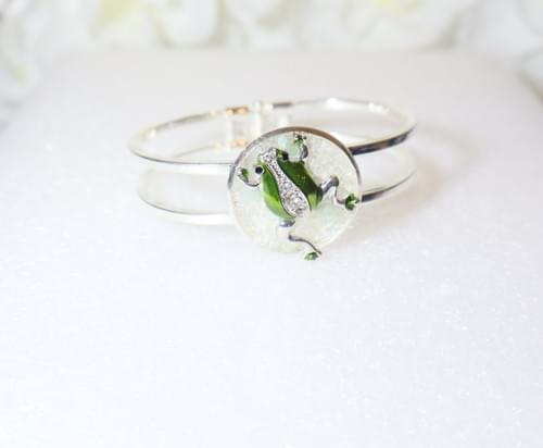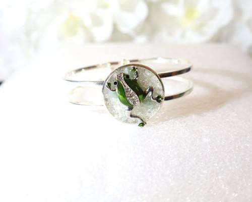 Introducing Tranquil Frog, our double-strand cuff bracelet boasts a whimsical fusion of elegance and natural beauty. From our Healing Collection, this exquisite bracelet features a round bezel embedded with a captivating green enamel frog on a bed of sparkling White Quartz (known for divine energy), evoking tranquility and peace. The flexible design ensures a comfortable fit, while the silver tone adds a touch of sophistication to any ensemble. Wear as a statement piece or layered.