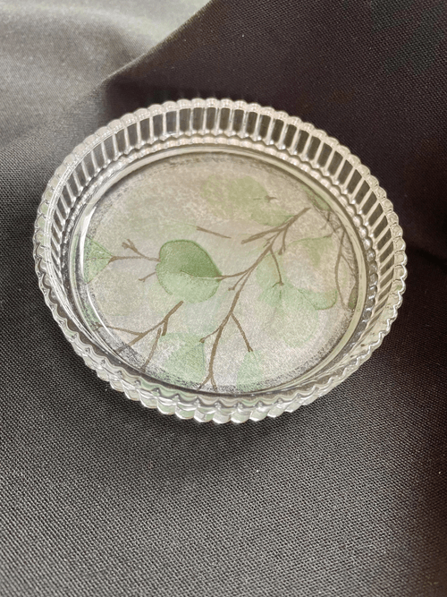 Perfect for coins, jewelry, candies, and more! This lovely leaf design decoupage-on-glass Trinket Dish has a zen-like aura and is the perfect place to store your jewelry and other small items on your dresser, nightstand, or to place your keys by the front door. Four silicon button cushions protect the base. Practical and pretty, you'll love this addition to your home decor.