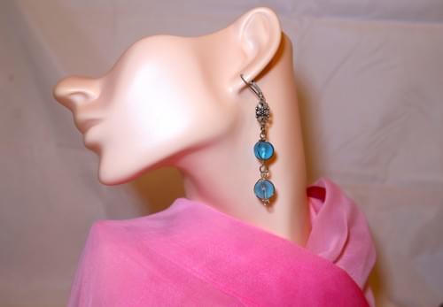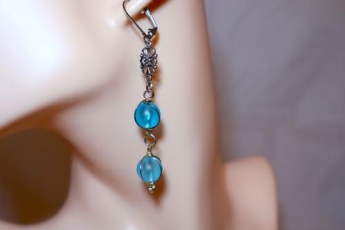 Mesmerizing turquoise blue glass beads wrapped in silver strands dangle from a classic filigree charm! These eye-catching 2.25 inch drop earrings will lift your spirits and are perfect for any occasion. Silver-tone lever back closure.