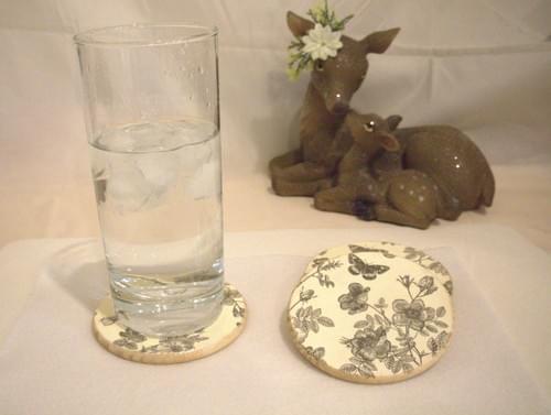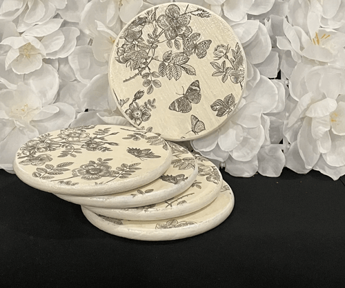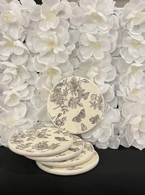 The classic colors of cream and black give these amazing, decoupage on wood coasters a beautiful Vintage and mildly distressed look. Each coaster has a cork base pad that protects table surfaces from scratches. This set of 5 coasters come with a matching holder.
