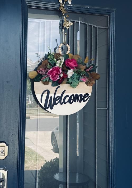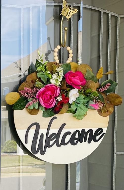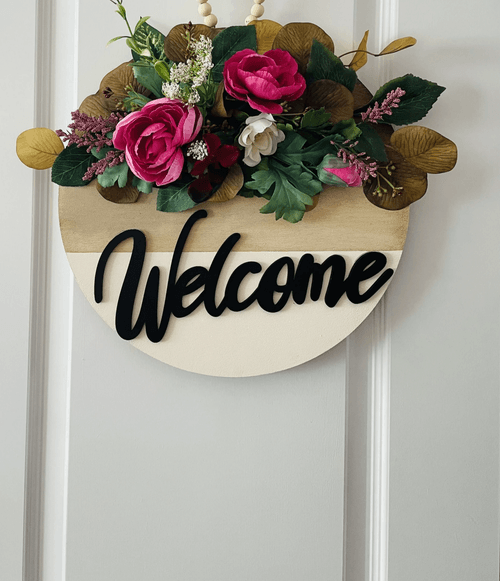 Say a warm "welcome"! Classy and beautifully designed, this wood door/wall sign comes in three warm shades of brown and boasts a simple array of greenery with rose/white, and purple florals. The charming, beaded jute hanger adds a bit of whimsy to the design.