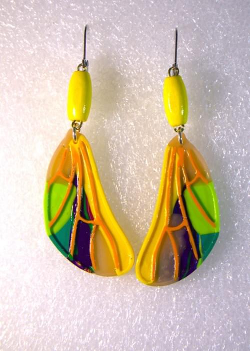 Hand-painted, polymer, these Butterfly Wing earrings are a captivating fusion of nature-inspired beauty and artisanal craftsmanship. Each meticulously hand-painted wing is crafted to capture the delicate intricacies of nature. Elegantly paired with a glossy wood bead, these 2.5" long, lightweight earrings are mounted on silver-toned hypoallergenic lever backs, ensuring comfort and style for all-day wear. For a touch of whimsy to your everyday look or to compliment your evening ensemble, these exquisite earrings are sure to elevate your style.